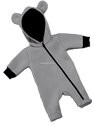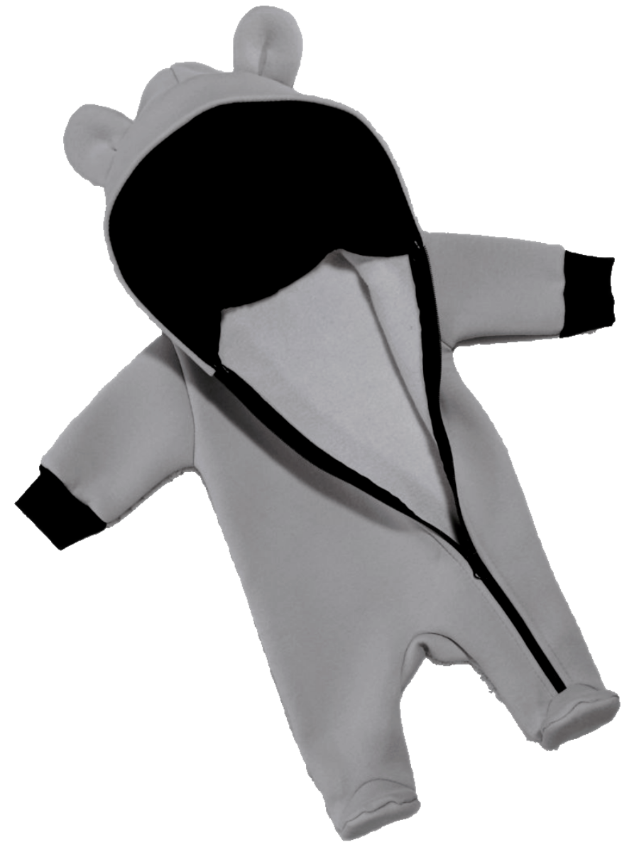 Комбинезон с закрытыми ножками, с капюшоном на подкладке, на молнии по всей длине и до конца одной ножки.