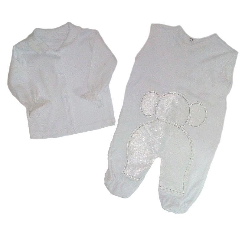 1. Полукомбинезона с закрытыми ножками, спереди и между ножек на кнопочках. Комбинезон украшен спереди и сзади аппликацией в виде слонёнка.